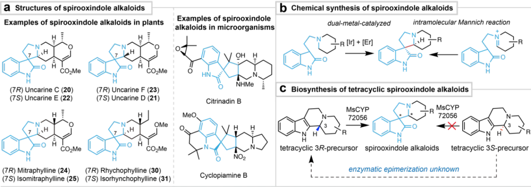 图2. 螺环氧化吲哚生物碱的化学结构、化学合成以及生物合成