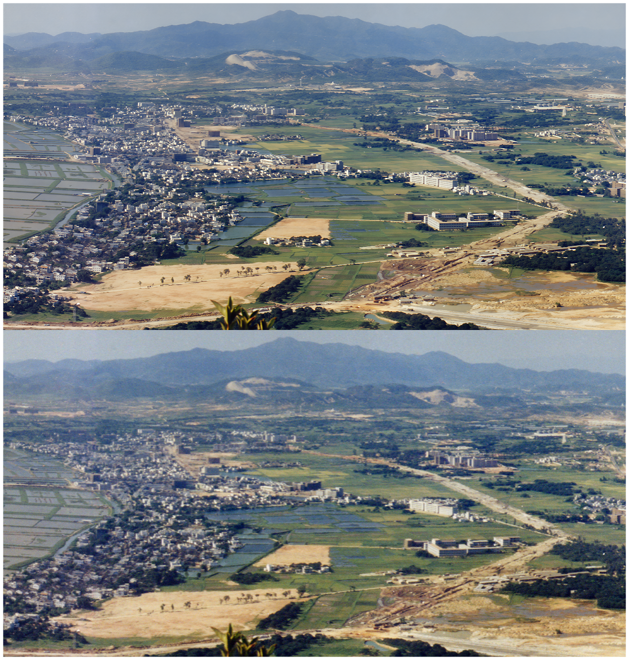 1985年的深圳南头半岛(下图,摄影:陈宗浩)与4倍超分修复(上图)后的对比图