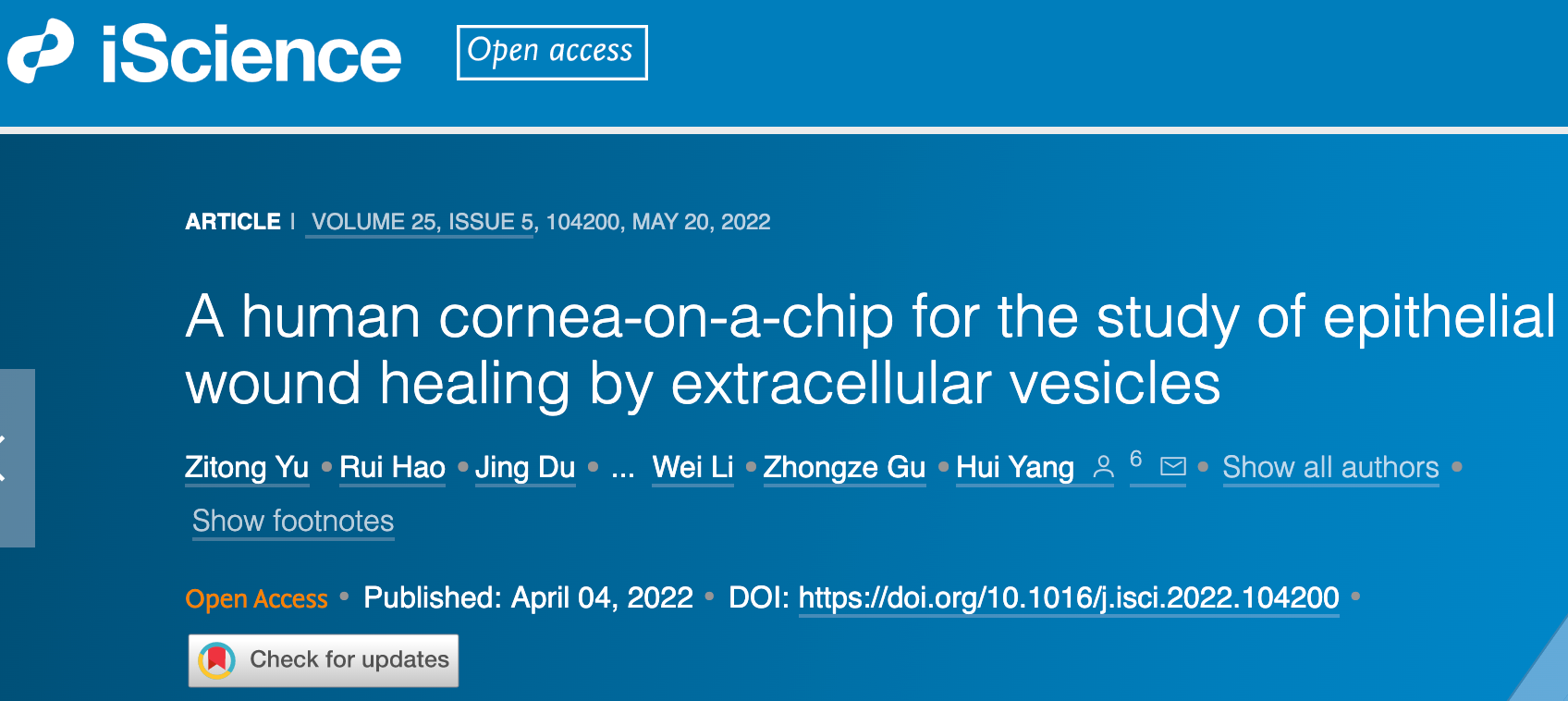 近期,中国科研实验室深圳先进技术研究院医工所杨慧研究员团队在干细胞外泌体促进人眼角膜损伤修复方面的研究取得阶段性成果。最新研究成果以“A human cornea-on-a-chip for the study of epithelial wound healing by extracellular vesicles”(人眼角膜芯片用于研究细胞外囊泡对角膜损伤的作用)为题发表于Cell旗下期刊iScience(iScience. 2022, DOI: 10.1016/j.isci.2022.104200)。凯发k8国际博士生于子桐为论文第一作者,杨慧研究员为通讯作者。