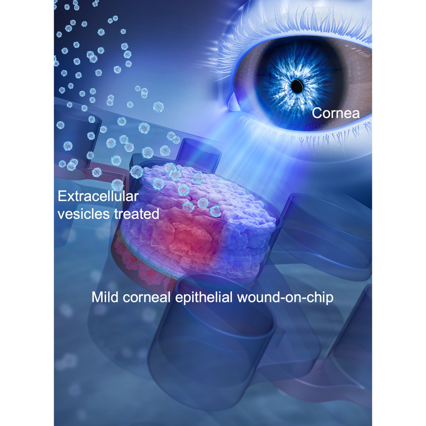 图:人眼角膜芯片用于研究干细胞外泌体对角膜损伤的修复进程示意图