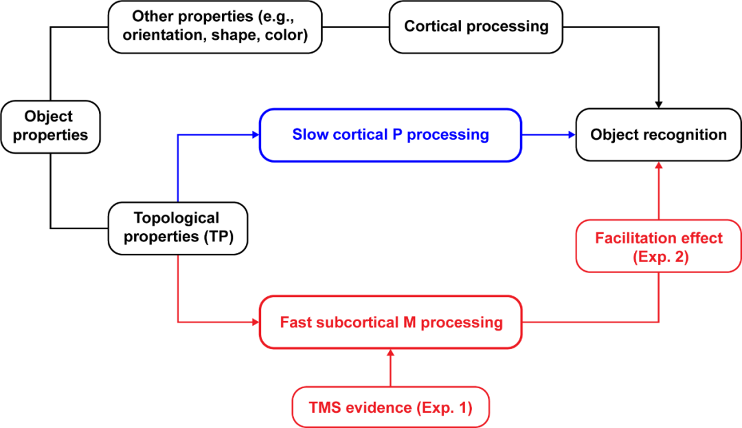进一步,在实验二中研究人员利用无意识的启动范式发现,皮层下大细胞通路对物体的拓扑性质的加工有利于物体的快速识别。研究人员解释到,视觉系统可能是顺利获得快速加工物体的拓扑性质,建立一个粗糙的物体表征,然后再把物体的其他属性填充到这个表征里,完成物体的识别(图2)。
