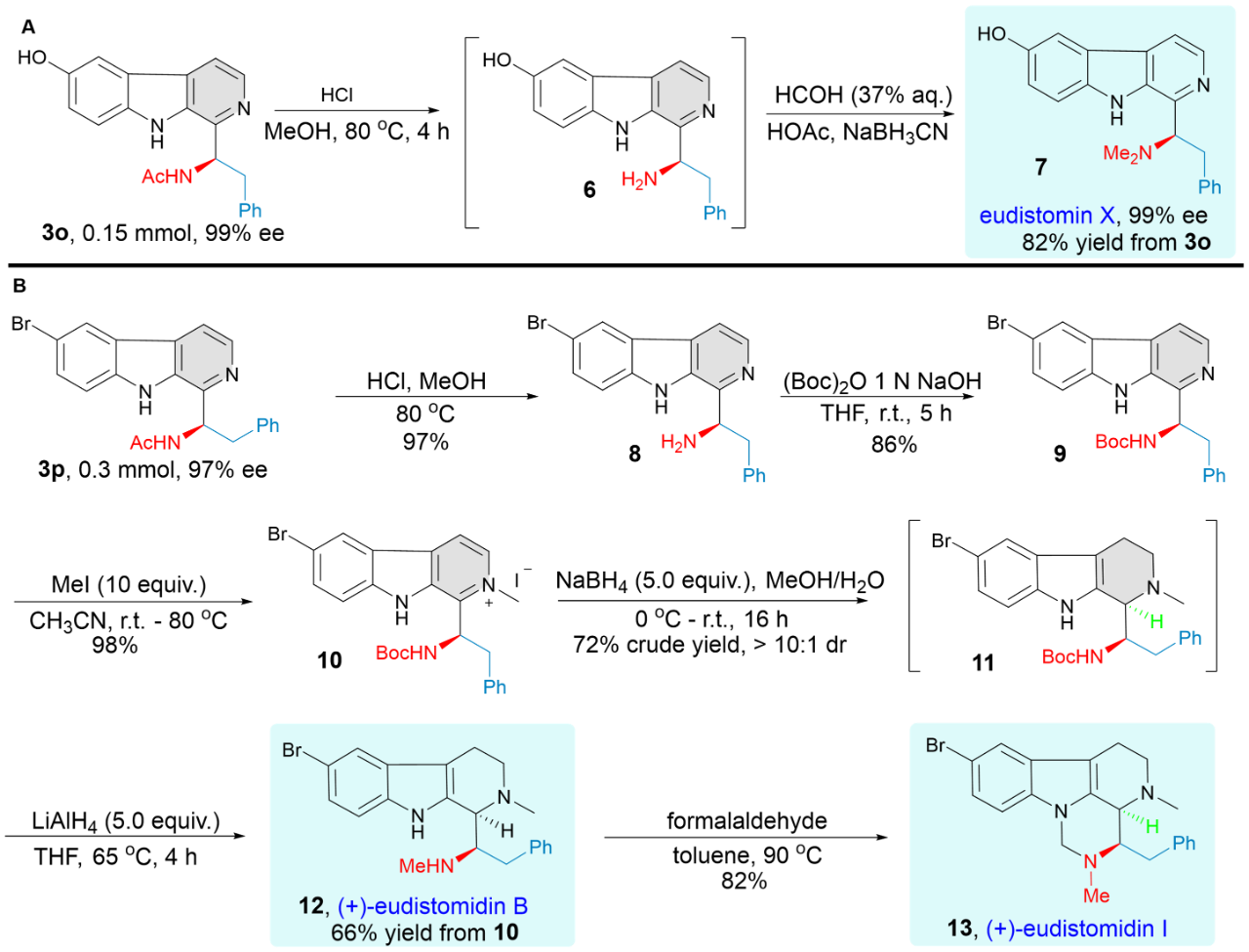 Fig 1. Total synthesis of β-carboline marine alkaloids. (A) Total synthesis of eudistomin X. (B) Total synthesis of (+)-eudistomidin B and (+)-eudistomidin I.