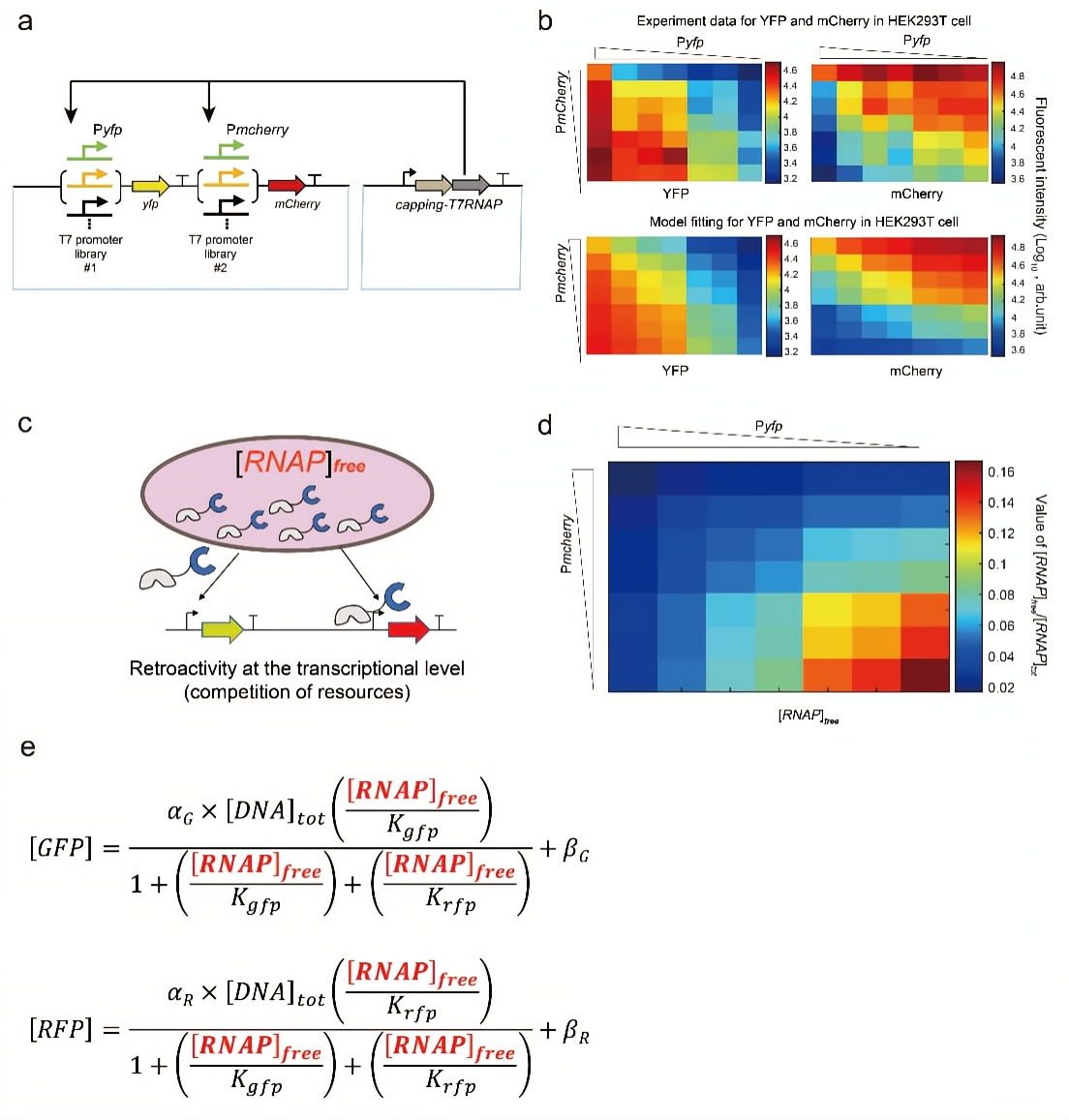 本论文发现了不同基因表达活性的竞争效应,并建立了定量的热力学模型。针对两个基因的竞争问题,研究团队设计了一个哺乳动物细胞系中的两个报告基因(图2)。在这个双报告基因体系中,每个报告基因由正交型启动子库中的七个代表性启动子之一控制,共有49种不同的组合。实验结果发现一个基因的强启动子显著降低了另一个基因的表达。这个结果证明了两个报告基因在竞争有限资源( [RNAP]free)。因此,本论文提出了利用[RNAP]free取代的[RNAP]tot的新型热力学方程式(图2e)。