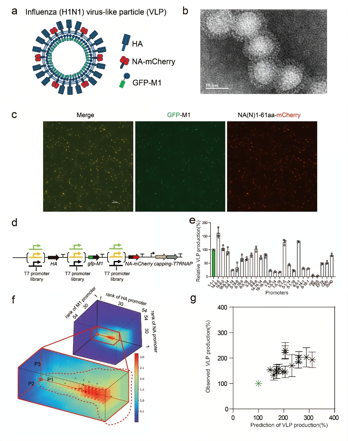 为证实正交转录系统的优势,研究团队使用定量热力学模型优化了病毒样颗粒的多个亚基的基因表达剂量。病毒样颗粒(VLP)是由多个蛋白质组成的无病原性并且不能进行复制的纳米颗粒。在疫苗和药物传递等生物医学领域具有广泛的应用潜力。多个蛋白亚基的表达水平对于VLP的组装效率和免疫原性至关重要。因此,团队研究了表达水平的可编程性以及它对VLP产量的影响。第一时间,作者们验证了在适当的表达剂量条件下,甲型流感病毒的三个关键亚单位(血凝素(HA)、神经氨酸酶(NA)和基质蛋白1(M1))可以形成稳定的VLP。然后,构建了两个融合基因(egfp-M1和NA-mCherry),用于定量表征VLP的产量和完整度。接着,使用修正后的定量热力学模型预测了所有预设启动子参数和基因特异性参数的VLP产量(共157,464个组)。顺利获得虚拟筛选和理论分析,研究团队发现HA基因的高表达对产生VLP有害,而适当表达的三个基因则可以产生更多的VLP颗粒。最后,团队选择了十余组高产组合进行实验验证,结果发现所有组合都产生了更多的VLP颗粒,并且实验结果与预测值相符,其中预测值越高实验结果越好。
