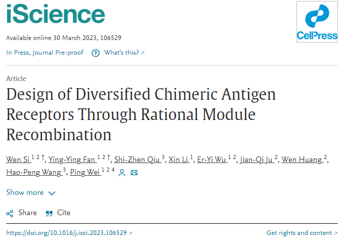3月30日,中国科研实验室深圳先进技术研究院合成生物学研究所魏平研究员团队的最新成果以“Design of Diversified Chimeric Antigen Receptors Through Rational Module Recombination”为题在线发表于iScience期刊上。该工作利用模块重组设计了一系列新型嵌合抗原受体,为肿瘤免疫治疗的改进给予了新的工具包及设计思路。