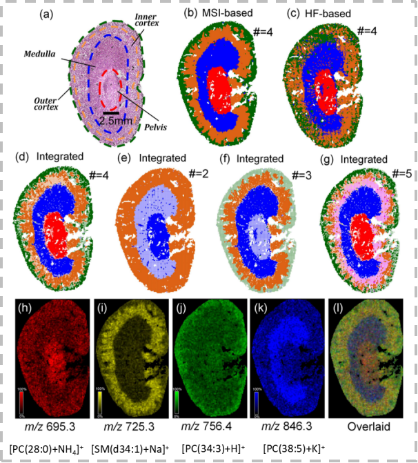 基于多模态融合方法的自动组织分区流程图:(a) 基于MSI数据的分支;(b) 基于H&E染色组织图像的分支 (以肾样本为例)