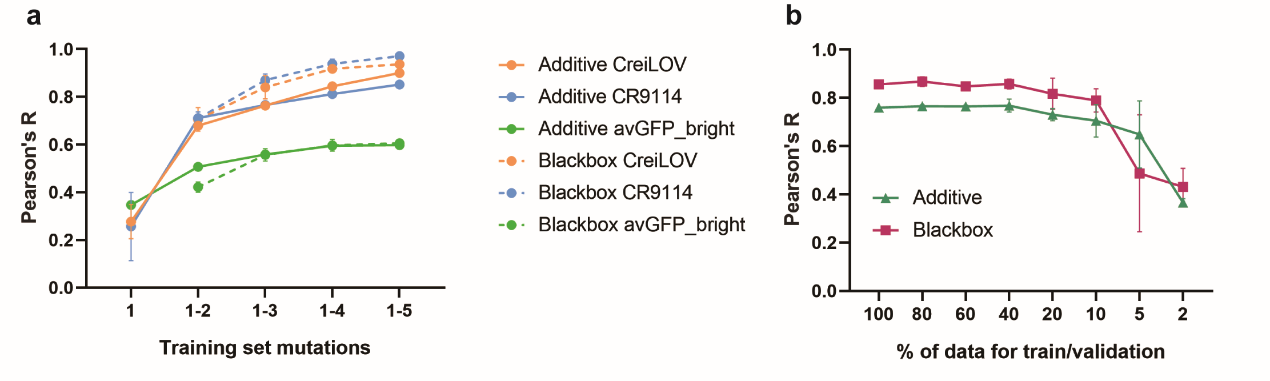 如前所述,为取得更优的表型常需要在氨基酸序列中引入多点组合突变,而组合爆炸(combinatorial explosion)问题将为理性设计和实验测试均带来极大挑战。为了探究能否利用低阶突变体数据集预测高阶突变组合效应,作者使用1/2/3/4/5阶突变体数据对MAVE-NN机器学习模型进行训练,发现使用3阶及以下突变体数据集预测6阶以上突变效应时,模型预测与实验结果的Pearson相关系数可达0.84。值得注意的是,在仅使用1-3阶突变体数据集中10%的子集时,即可实现相对准确的预测(Pearson相关系数0.79)(图4)。进一步,作者利用文献报道的其他机器学习模型ECNet和其他组合突变数据集(CR9114和avGFP),探究了利用低阶突变数据预测高阶突变组合效应的普适性和限制因素。