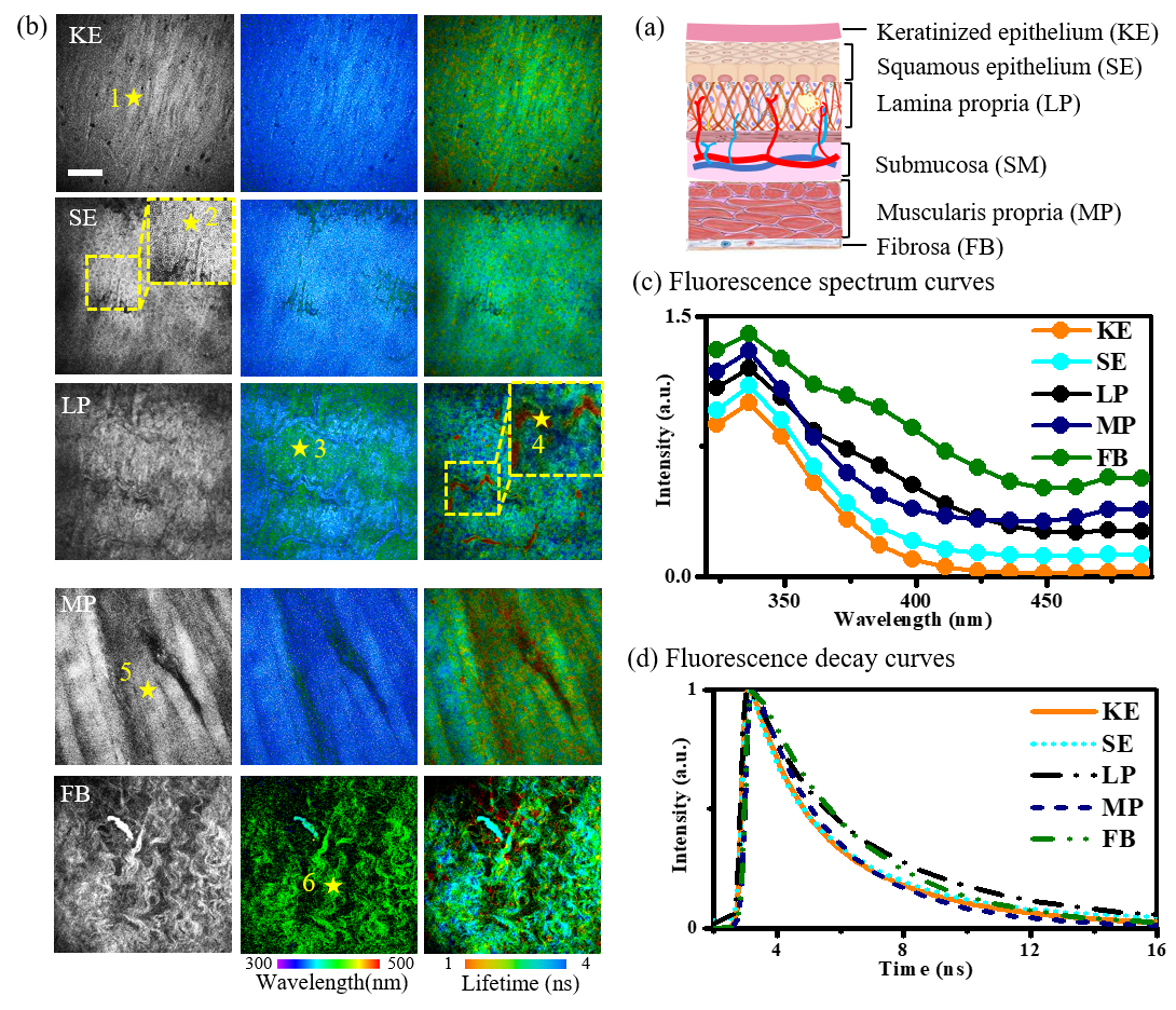 随后,研究团队对不同的生物组织进行了成像,包括离体大鼠食管组织和离体大鼠口腔面颊组织。结果表明,该系统可以在不需要任何外加造影剂的情况下为生物系统给予高分辨率的三维形态信息和物理化学信息。该研究工作探索了短波长的内源性荧光团在食管壁中的分布。研究结果表明,该系统可以很清晰的看到食管的不同分层结构:上皮细胞(KE、SE)、固有层(LP)、粘膜层(SM)、外纵肌(MP)、纤维膜(FB)。而食管癌主要就发生在食管内部上皮细胞、固有层和粘膜层这些地方。结合寿命和光谱信息,系统可以明确识别食管内部多层结构的不同信号来源,定量区分不同组织成分在食管壁的位置和数量,区分食管分层结构。