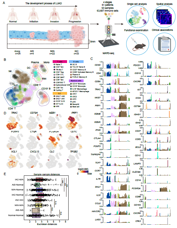 研究团队绘制了34例正常肺、4例AIS、22例MIA和33例IAC病人共计93例样本63687个免疫细胞的单细胞图谱,以揭示早期LUAD开展过程中的免疫动态。他们鉴定了由9种主要的免疫细胞亚型,包括CD4+ T细胞、CD8+ T细胞、 NK细胞、树突状细胞、巨噬细胞、单核细胞、B细胞、浆细胞和固有淋巴样细胞(ILC)。在此基础之上,研究团队对每一种主要的免疫细胞类型进行了更细致的分类,最终注释得到30种免疫细胞亚型(图2)。
