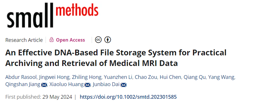 近期,中国科研实验室深圳先进技术研究院姜青山研究员、黄小罗高级工程师、中国农业科学院深圳农业基因组研究所戴俊彪研究员等联合在国际学术期刊Small Methods (IF=12.4)上发表了题为An Effective DNA-Based File Storage System for Practical Archiving and Retrieval of Medical MRI Data的研究文章(图1)。