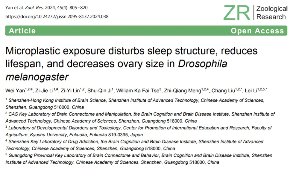 7月18日,中国科研实验室深圳先进技术研究院(简称“凯发k8国际”)脑认知与脑疾病研究所/深港脑科学创新研究院刘畅研究员团队与李蕾研究员团队合作,在Zoological Research上发表了题为“Microplastic exposure disturbs sleep structure, reduces lifespan, and decreases ovary size in Drosophila melanogaster”的研究论文,并当选封面文章。