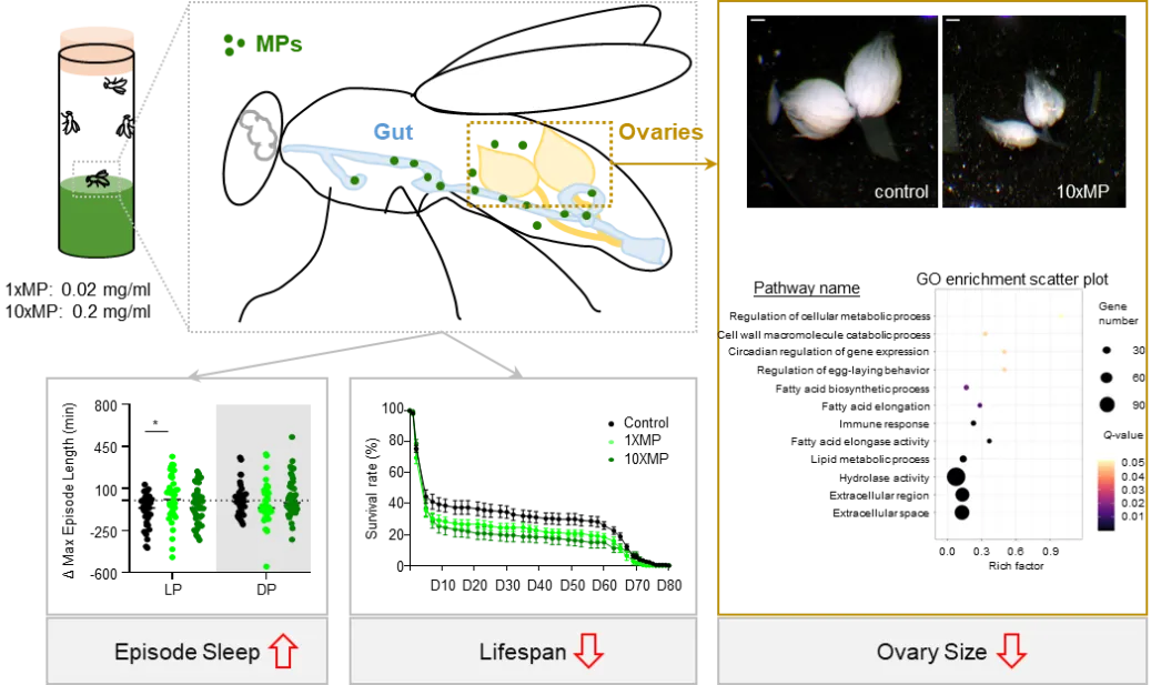 研究团队利用陆生动物黑腹果蝇为模型,对脑、肠以及卵巢这几种组织器官进行系统比较,并结合行为学与转录组分析等,发现饮食摄入微塑料会导致睡眠结构紊乱、寿命缩短以及生殖力损害,并表征了其对多条信号通路的基因毒性影响。