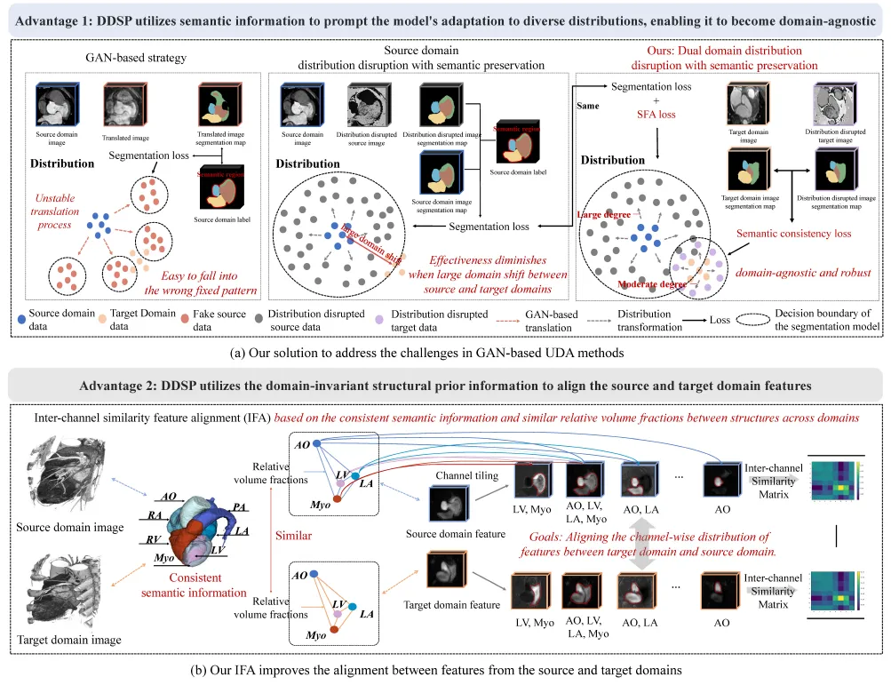 为分析决这些问题,本研究提出了一种全新的双域分布多变-语义约束的三维方法(DDSP),顺利获得结合双域分布干扰与语义保持策略,显著提升了模型在不同成像条件下的泛化能力,且无需目标域的标注数据。除此之外,本研究还引入了基于域不变结构先验信息的特征对齐模块,促进双域共享参数的分割器在目标域特征上的性能。