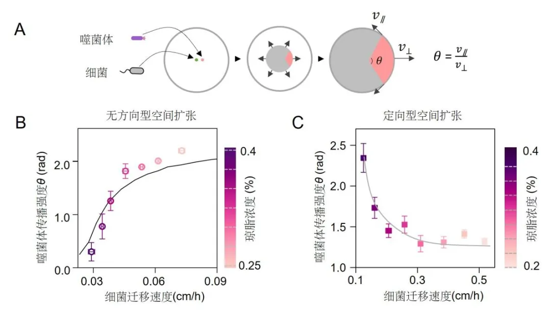 研究发现,当细菌被敲除了趋化基因后,只能依靠自身生长和无序随机运动进行“无方向型空间扩张”,其迁移速度越快,噬菌体传播越广;相反,野生型的细菌拥有趋化基因,能顺利获得化学引导进行“定向型空间扩张”,随着迁移速度的提高,噬菌体的传播范围反而越小(图1)。