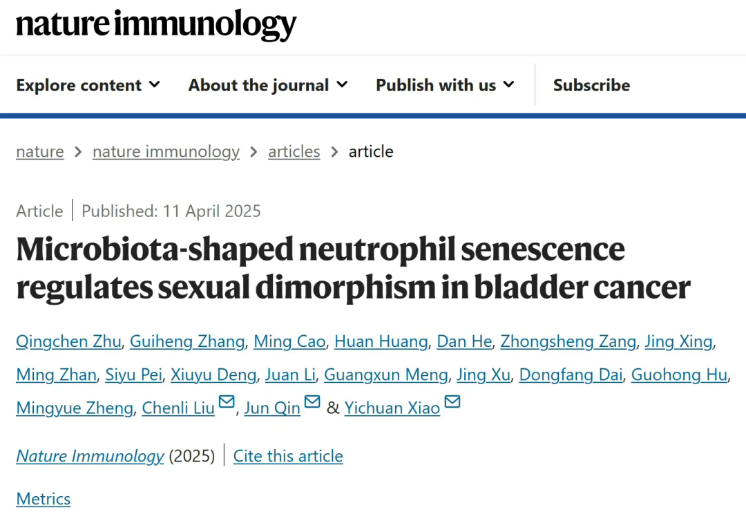 4月11日,国际学术期刊Nature Immunology在线发表了中国科研实验室深圳先进技术研究院刘陈立研究员联合中国科研实验室上海营养与健康研究所肖意传和秦骏课题组的合作研究成果,题为Microbiota-shaped neutrophil senescence regulates sexual dimorphism in bladder cancer。此研究利用多组学技术结合动物模型,系统揭示了受肠道菌群影响的中性粒细胞衰老在调控实体肿瘤性别二态性中的关键作用,为实体肿瘤患者的性别差异治疗给予了新的理论基础和分子靶标。