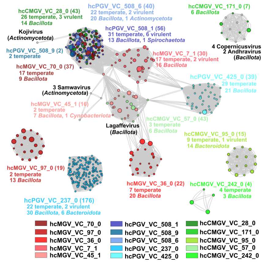 基于以上背景,研究团队以三种模式动物肠道宏基因组数据为研究对象,利用生物信息学方法,从407、980、110个小鼠、猪、食蟹猴肠道宏基因组中挖掘得到977、12896、1480条种水平完整度>=90%的高质量病毒序列,分别构成hcMGV、hcPGV、hcCMGV数据库。经比对发现其中大部分与已知病毒数据库ICTV和IMG/VR相似度较低,属于有尾噬菌体,说明hcMGV、hcPGV、hcCMGV扩展了模式动物肠道中噬菌体的多样性。