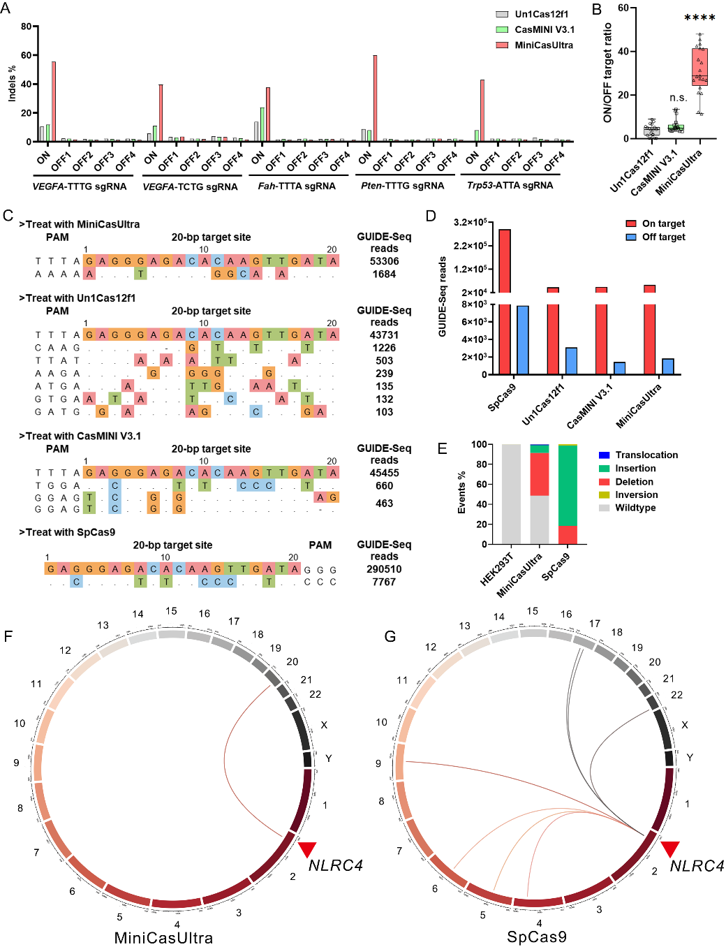 MiniCasUltra同时具有低脱靶活性,高安全性。研究人员采用多种方式交叉验证工具的脱靶活性和安全性,其中包括借助Cas-OFFinder对多个位点的脱靶序列预测并经深度测序验证、利用GUIDE-Seq在全基因组层面验证脱靶情况以及利用PEM-Seq测试全基因组内脱靶造成的染色体重排事件。