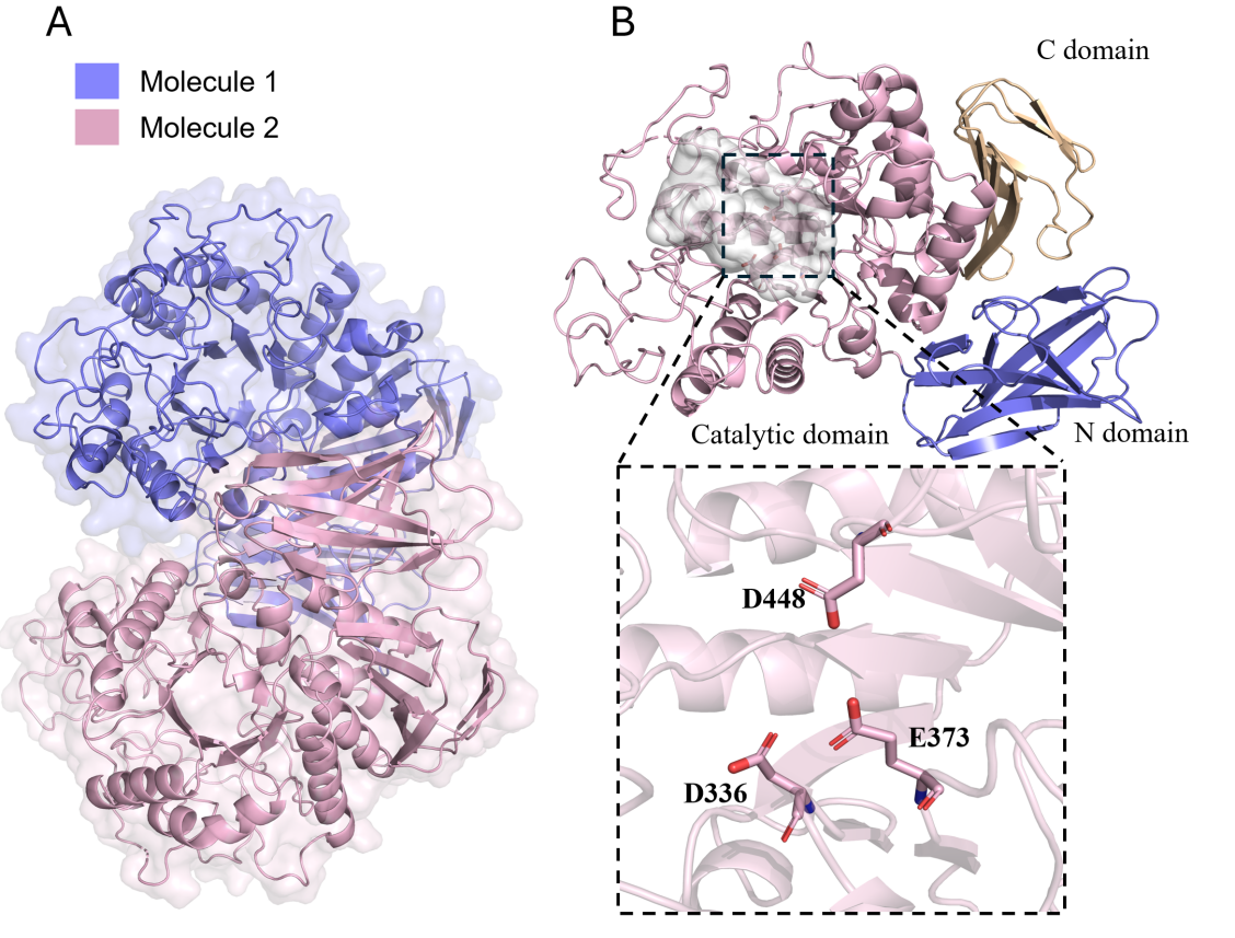 Apg属于糖苷水解酶家族13_21 (GH13_21),通常负责水解α-1,4-O-糖苷键。但其独特之处在于能有效水解结构复杂的阿卡波糖。研究解析了Apg的高分辨率晶体结构(图3):(1)Apg在溶液中以同源二聚体形式存在,单体间顺利获得N端结构域和催化结构域呈头尾排列。(2)催化结构域采用经典的TIM桶折叠,活性位点是位于TIM桶顶部的一个突出表面凹槽,凹槽底部有一个绝对保守的催化三联体(Asp-Glu-Asp)。(3)与其他淀粉酶(如MaIZ, MaIS)相比,Apg的活性口袋裂隙更窄(7.9 Å),能紧密结合阿卡波糖,计算也显示其对阿卡波糖的结合亲和力更高。(4)结合生化实验、晶体结构和计算分析,发现两个关键的柔性环(loop A和loop B)不仅影响底物结合还决定其催化能力。