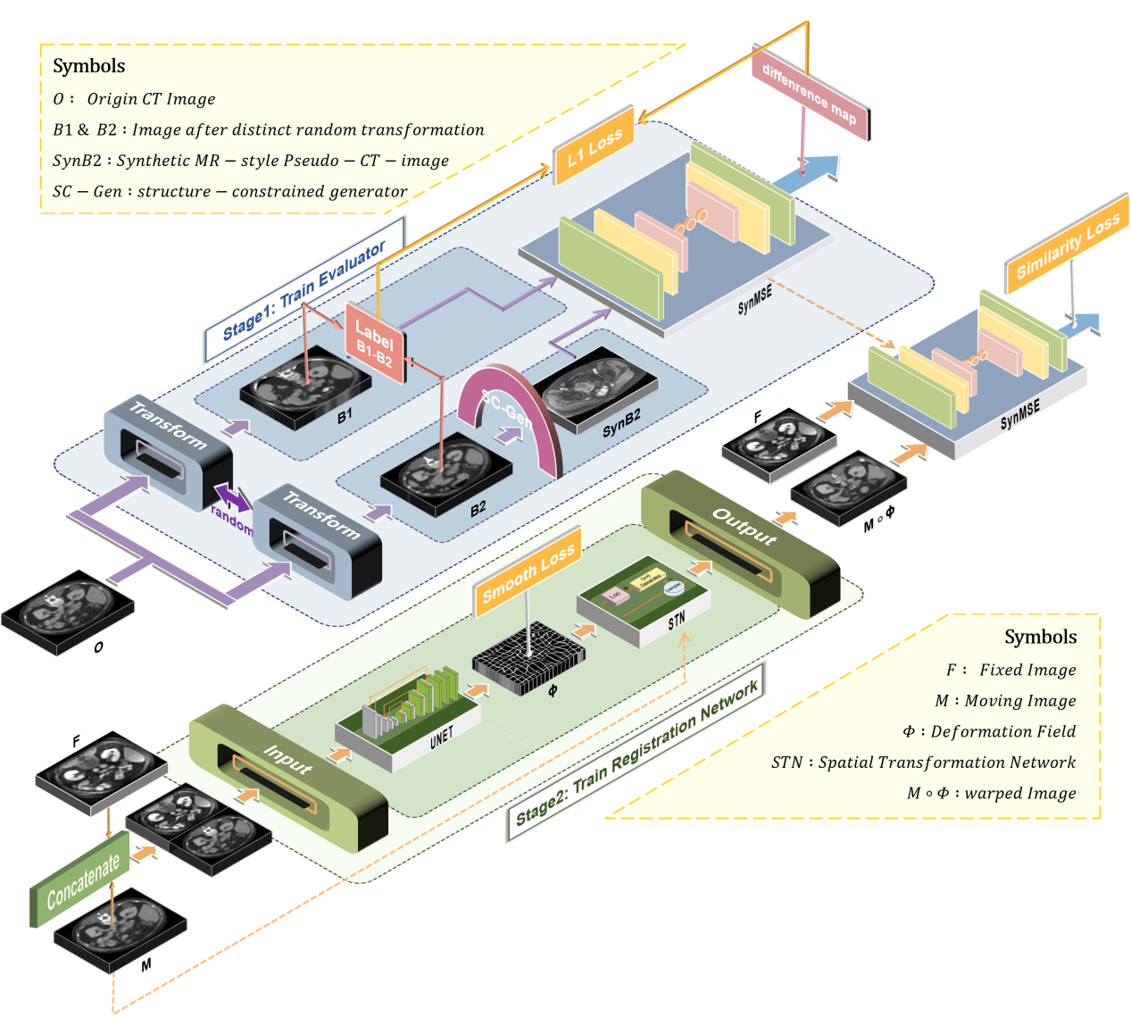 研究团队提出了一种全新的解耦空间与分布信息的无监督配准框架。具体而言,团队设计了一个基于 Structure-Constrained CycleGAN 的生成器,用于模拟模态间的灰度差异并保持解剖拓扑一致性;同时,顺利获得随机变换与伪影像生成分离空间错位与分布差异,使 SynMSE 评估器能够忽略模态特有的灰度差异,聚焦于空间对齐,从而作为即插即用的相似性度量模块无缝集成于任意配准网络中。
