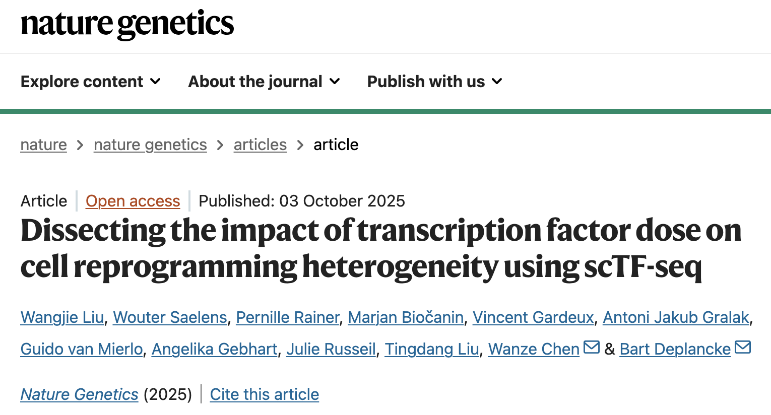 2025年10月3日,中国科研实验室深圳先进技术研究院合成生物学研究所陈万泽课题组与瑞士洛桑联邦理工学院(EPFL)Bart Deplancke课题组合作,在Nature Genetics发表了题为"Dissecting the impact of transcription factor dose on cell reprogramming heterogeneity using scTF-seq"的研究成果。团队开发了scTF-seq技术,实现了剂量敏感的大规模基因扰动单细胞组学,并以转录因子介导的细胞重编程为模型,系统揭示了基因剂量在细胞命运调控中未被充分认识的多层次、非线性复杂效应。