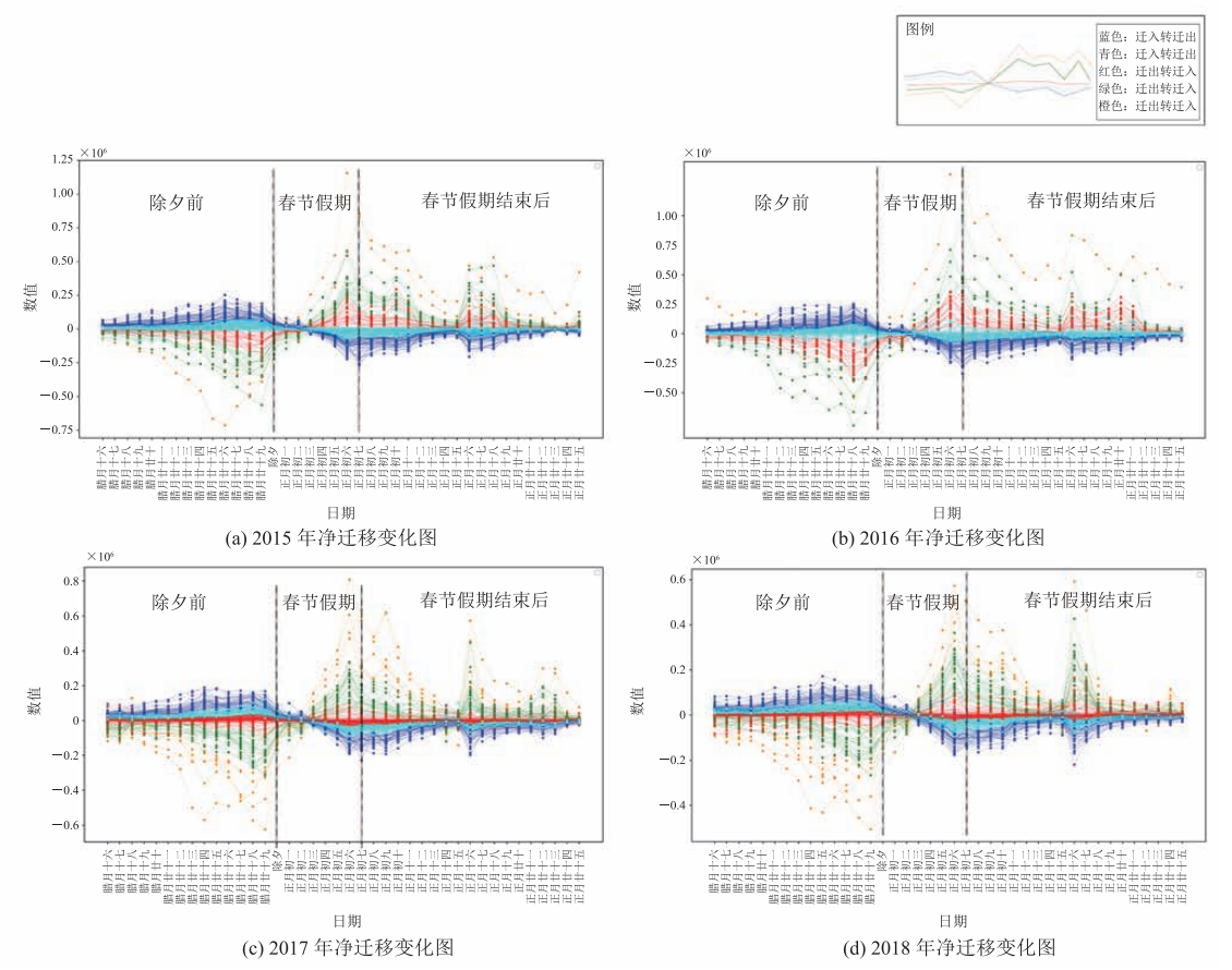 摘要:城市间的大规模人口流动一定程度上体现了城市间的关联性。该文选取腾讯迁徙数据库中 20152018 年官方春运期间全国人口迁徙数据,利用 Gephi 软件对人口联系强度进行可视化分析,获取全国城市间联系强度总体格局的变化特征。利用 DBSCAN 算法对全国城市进行时间序列聚类,讨论在春运不同时间节点的城市流动共性与差异。此外,该文还改进重力模型,以分析省内、省际人口流动的距离衰减效应。结果表明:(1)全国城市总体形成稳定的“菱形”结构,北京、上海、西安等城市形成单轴心空间组织模式,广东、深圳形成多轴心空间组织模式,一线城市中心性较强。除“菱形”结构外,西北部和东北部城市的中转和承接能力具有强大优势。(2)春节期间净迁移人口变化趋势较为稳定,春节前后形成对称式流入流出。(3)春运期间的流动符合距离衰减定律,随着距离的增加,城市吸引力在逐渐降低。