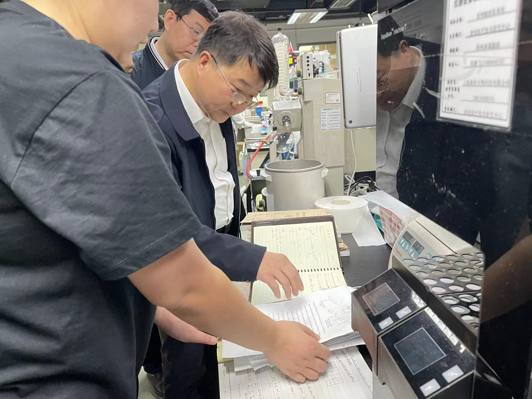 侯兴宇一行及先进院科研诚信专员组成检查组,检查了先进院科研诚信工作的建设情况。检查组抽查了部分课题组的科研原始记录,并与课题组长、其他科研人员进行现场研讨,顺利获得现场查阅实验记录本、问答研讨等方式,详细检查科研实验过程中的原始数据记录。经过现场问答和检查的工作示范,达到“以干代训”,增强了科研诚信专员的业务能力,便于研究所进一步规范科研原始记录管理工作。随后,召开科研诚信建设调研研讨会,检查组听取了先进院科研处喻学锋处长科研诚信和科技伦理建设工作汇报,对先进院进一步完善信息平台使用提出建设性意见,对加强原始记录本统一管理、科研原始记录的规范性等方面提出了要求。